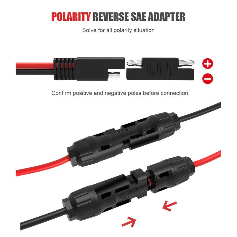 - 【 WHAT YOU GET?】1 X Solar Panel Connector to SAE port connector cable,2 X SAE to SAE polarity reverse connector,Months Product Warranty and Lifetime Technical Support, backed by 24/7 friendly customer service.