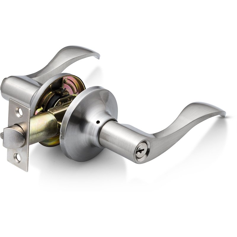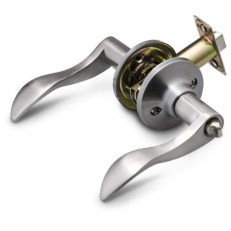 Our Premium Quality Wave-Styled Entrance door knobs is an ideal decorative accessory, professionally designed to perfectly compliment a wide range of traditional and modern residential interior doors. This deluxe hardware is creatively fitted with a, reversible, lever handle designed to perform very efficiently, whether it receives a left-handed or right-handed application. This original lockset comes with two keys. It also features a special square-corner striker and an incredibly adjustable dead-latch style which is 60/70mm. and is designed to fit doors between 1-3/8 inch and 1-3/4 inch. It has a satin nickel finish and is protected by a clear powder coat finish.
