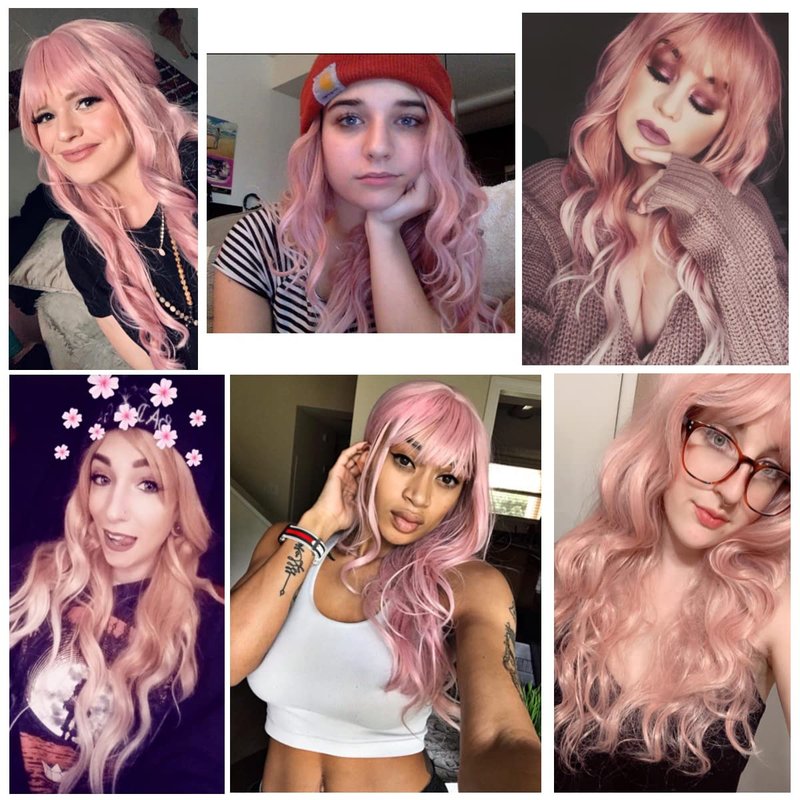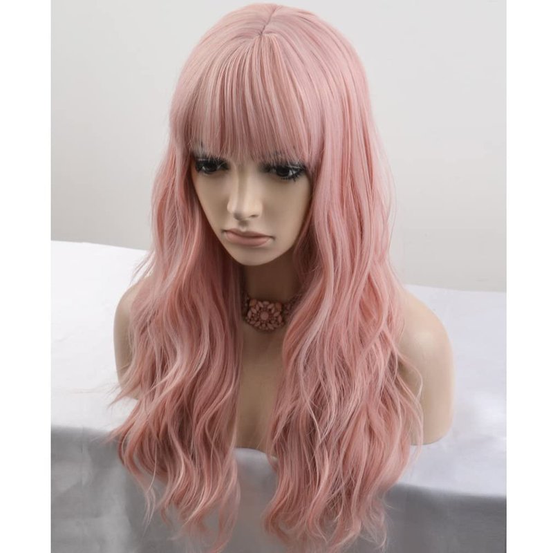 BERON 23 Inches Pink Wig Long Curly Wig with Bangs Synthetic Wig Women Girls Lovely Pink Wigs with Wig Cap