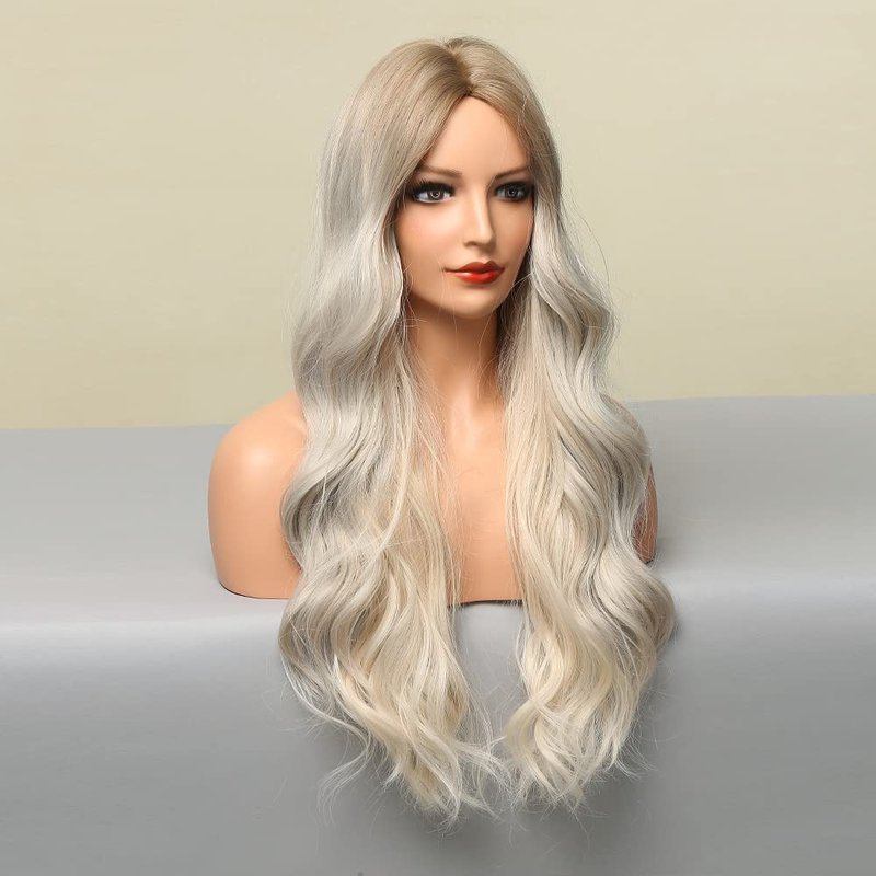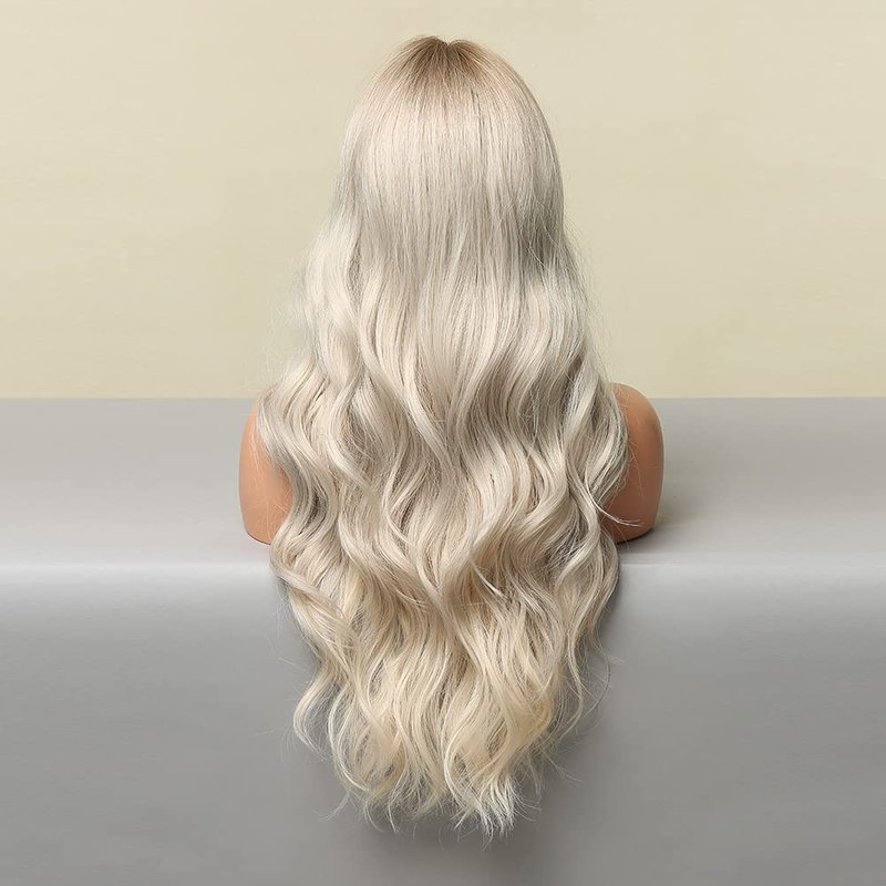 BERON Platinum Blonde Wig Long Wavy Wigs Platinum Blonde with Dark Roots for Women Platinum Blonde Wigs Synthetic Wig for Daily Party Wig Cap Include