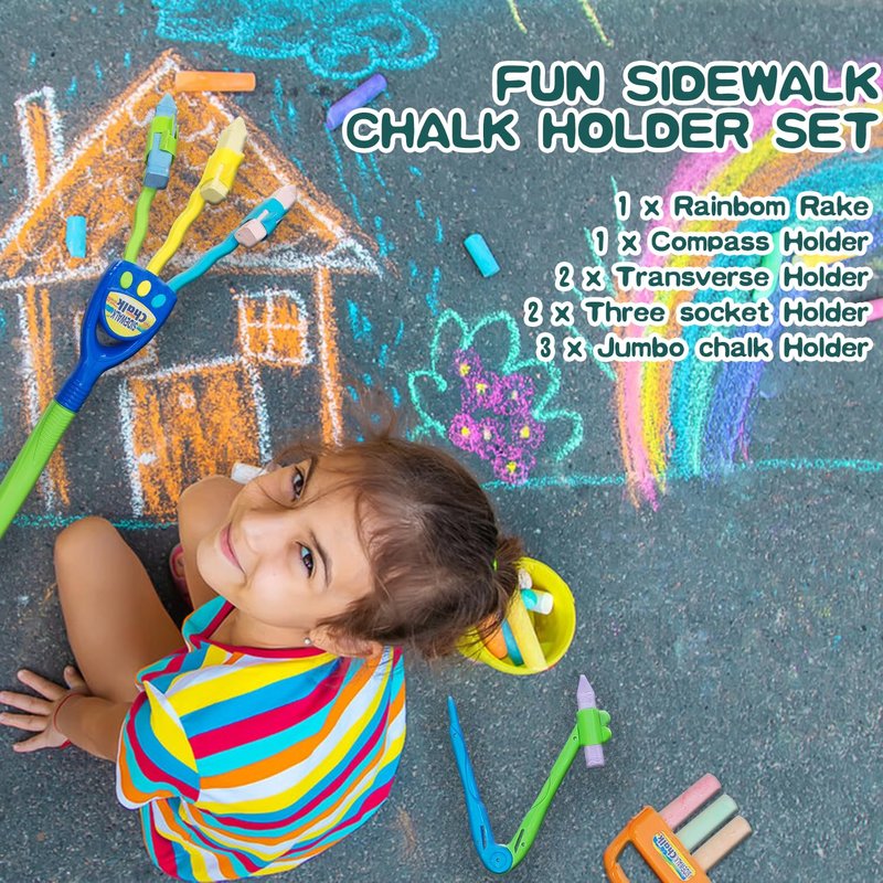 - 📦 【 FUN SIDEWALK CHALK HOLDER SET】:This set includes 1 rainbow rake, 1 compass holder, 2 transverse holders, 2 three socket holders, and 3 jumbo chalk holders. Each item allows users to explore their imagination through outdoor play. Chalks are not included.