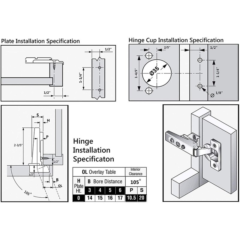 - ADJUSTMENTS: 4-Way 2-Cam adjustment features help the hinges to be easily installed. After mounting of the hinges, these 2-Cams allow the hinges to be adjusted by 4-Way appropriately to the cabinets. 2-Cam adjustments are Horizontal and Depth. After mounting the hinges to the cabinet, the hinges can be adjusted as third way vertically by the longitudinal holes in the plate.