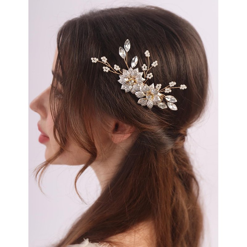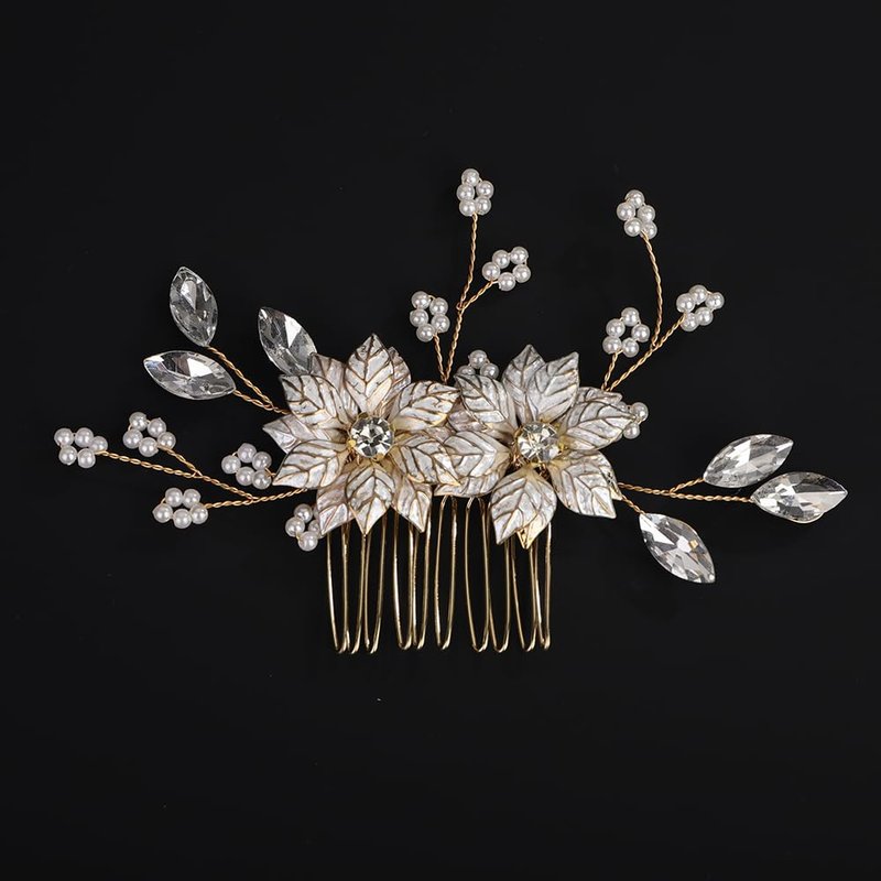 Elevate your bridal look with this exquisite gold leaves flower pearls hair side comb.Crafted with intricate details,this wedding hair comb features delicate gold leaves,shimmering pearls,and sparkling rhinestones that add a touch of elegance and glamour.Perfect for brides,bridesmaids,or any special occasion,this comb effortlessly complements your hairstyle while securing it in place.With its stunning floral and leaf motifs,this hair accessory is a true statement piece that will make you feel like a radiant goddess on your big day.Elevate your bridal ensemble with this captivating hair comb that seamlessly blends timeless beauty with modern sophistication.