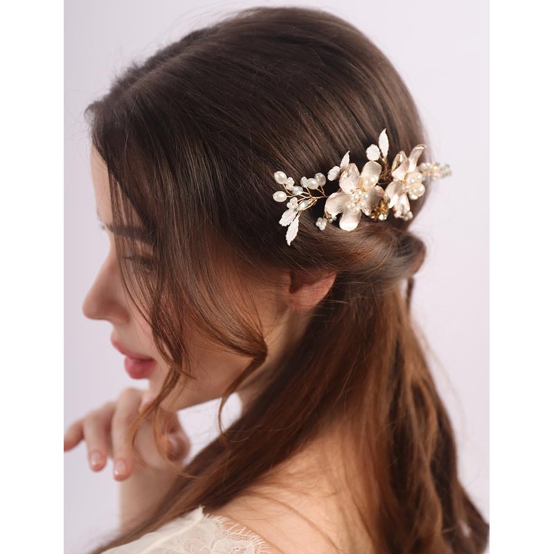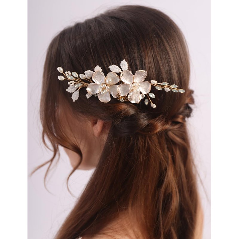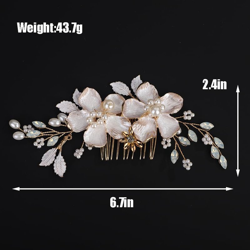 Elevate your bridal look with this exquisite opal rhinestone flower leaves hair comb.Meticulously handcrafted with intricate gold leaves,shimmering pearls,and sparkling rhinestones,this vintage-inspired headpiece adds a touch of glamour and elegance.The delicate floral design beautifully complements any wedding hairstyle,while the sturdy comb securely holds your tresses in place.Whether you're a bride,bridesmaid,or attending a formal event,this versatile comb effortlessly enhances your overall look.Indulge in timeless beauty with this captivating hair comb.