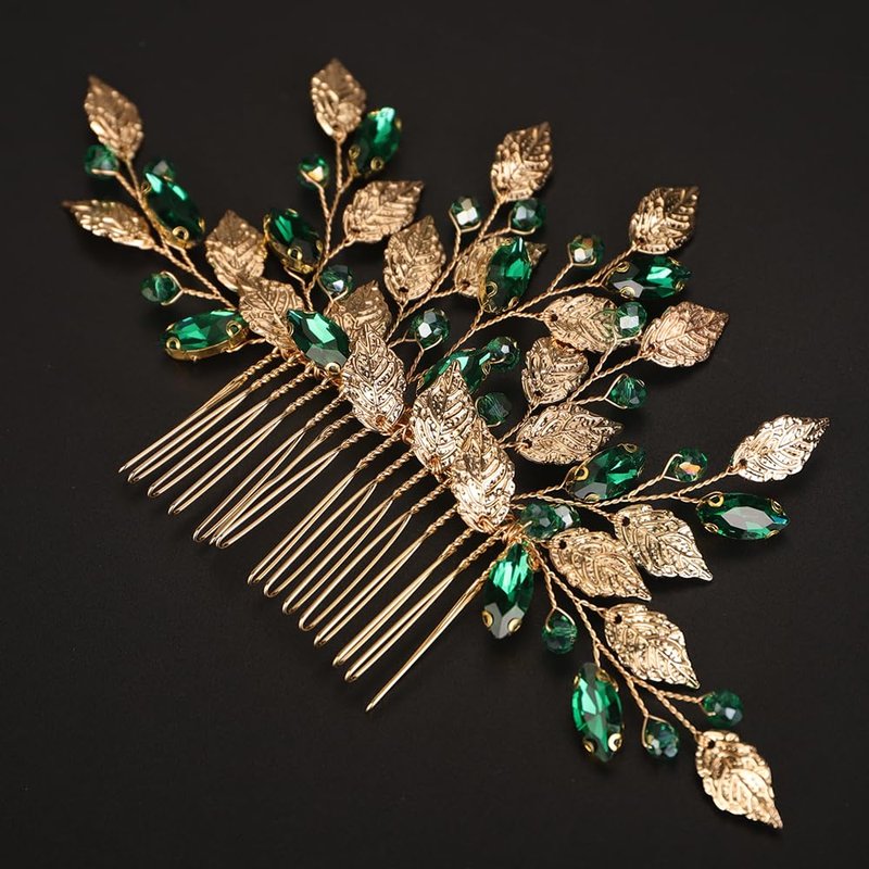 BERYUAN Wedding Gold Leaves Crystal Rhinestone Hair Comb Emered Green Crystal Rhinestone Hair Comb Leaves Gold Wedding Headpiece for Wedding Women