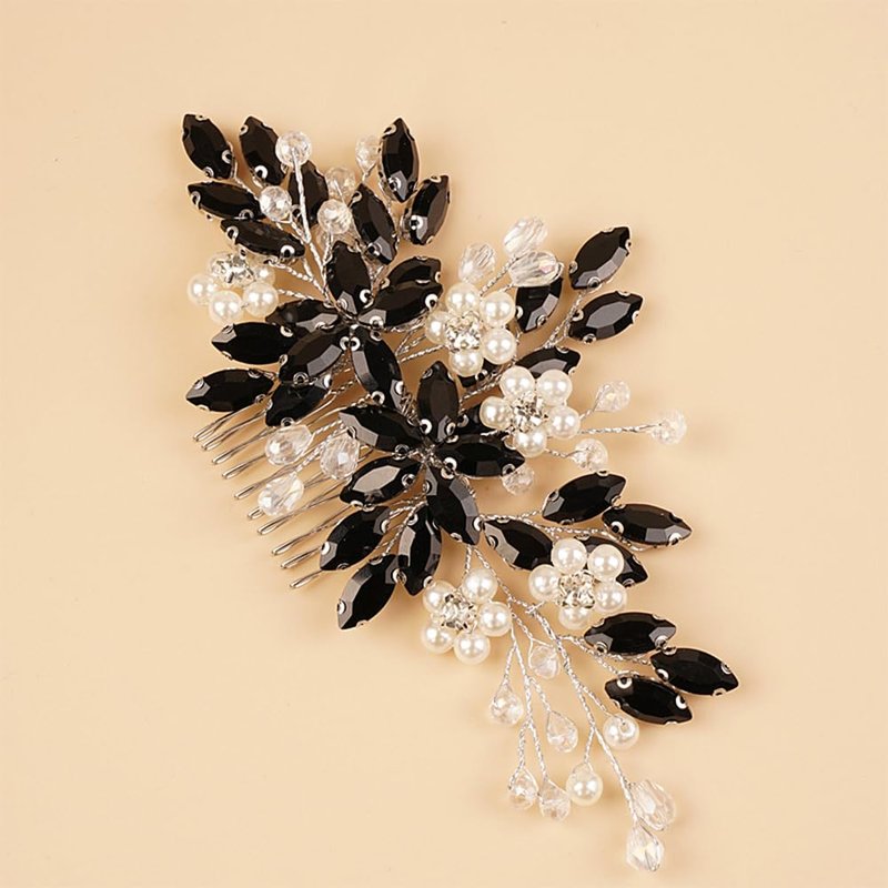 BERYUAN Wedding Pearls Crystal Rhinestone Hair Comb Pearls Crystal Flowers Bride Headpiece Black Crystal Pearls Wedding Hair Accessories Handmade Wedding Hairband for Wedding Women and Girls (black)