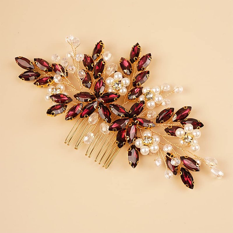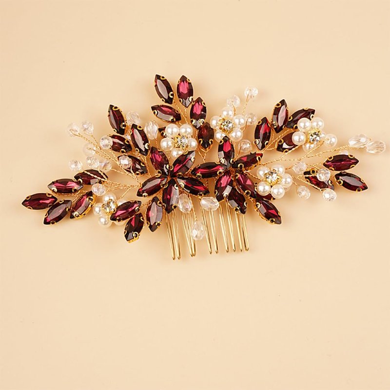 BERYUAN Wedding Pearls Crystal Rhinestone Hair Comb Pearls Crystal Flowers Bride Headpiece Red Wine Crystal Pearls Wedding Hair Accessories Handmade Wedding Hairband for Wedding Women and Girls (red