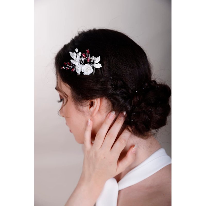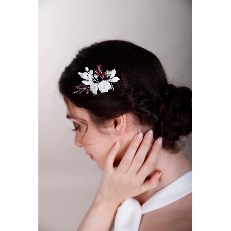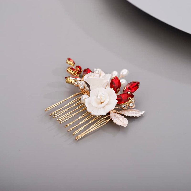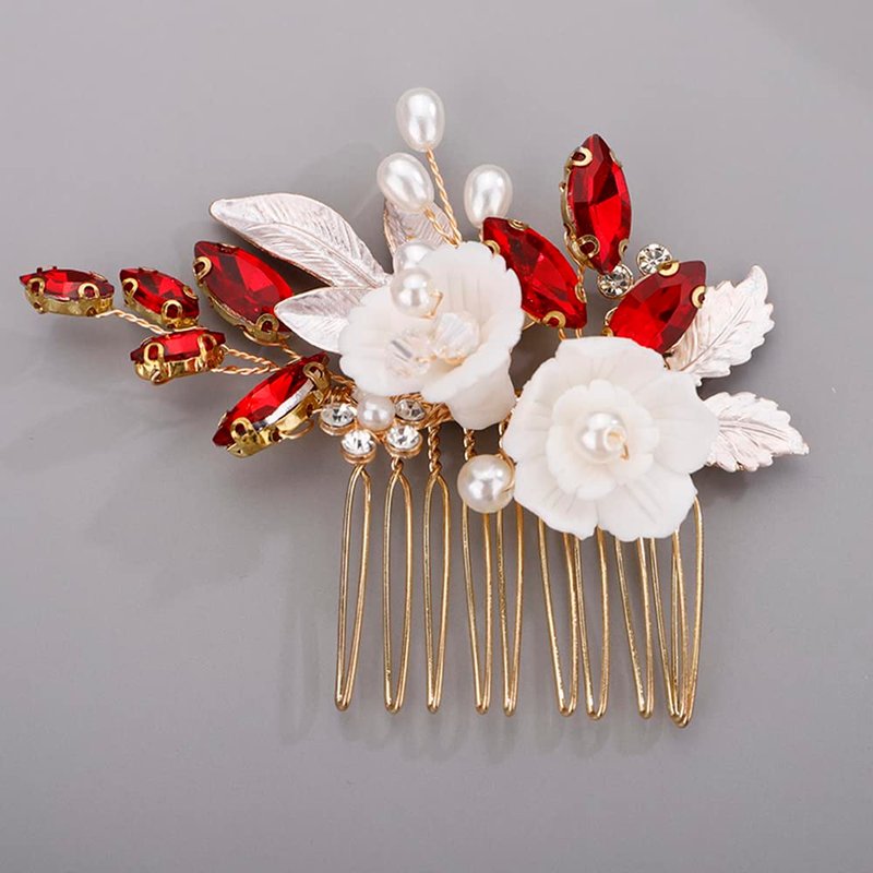 BERYUAN White Rose Flower Crystal Hair Comb for Women Cute Crystal Comb for Bride RED