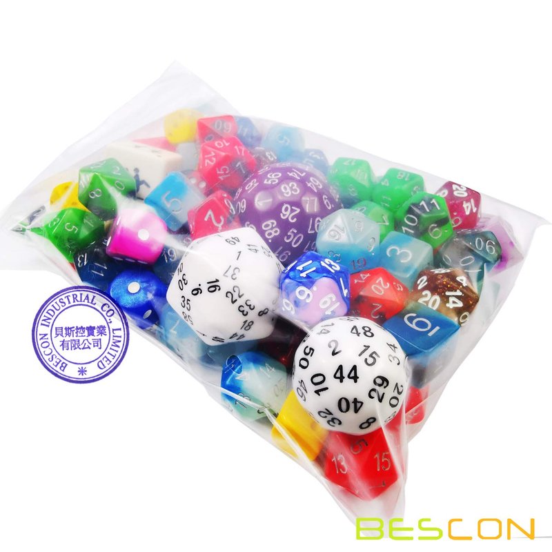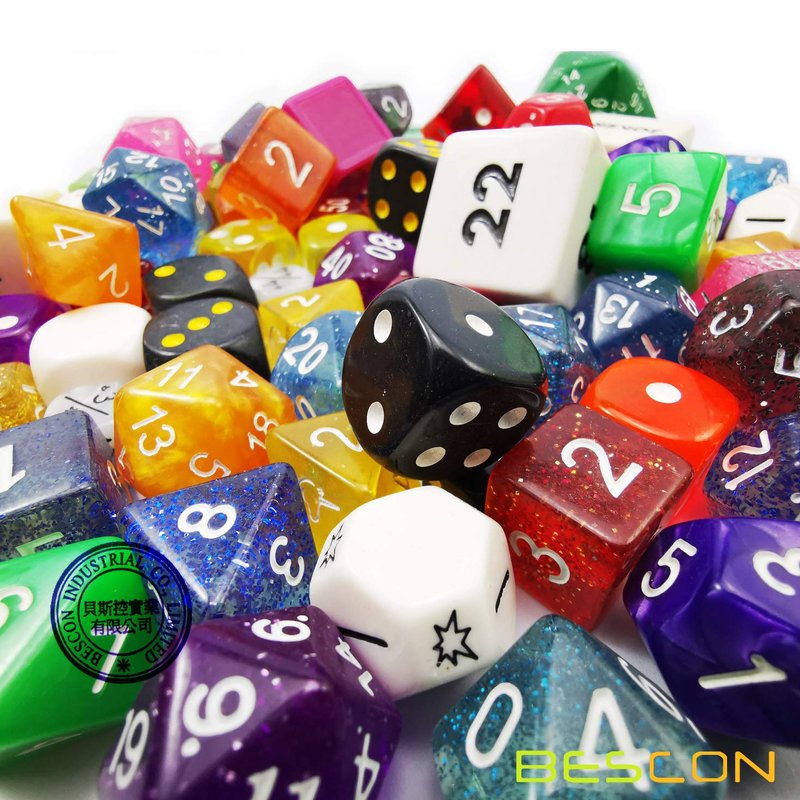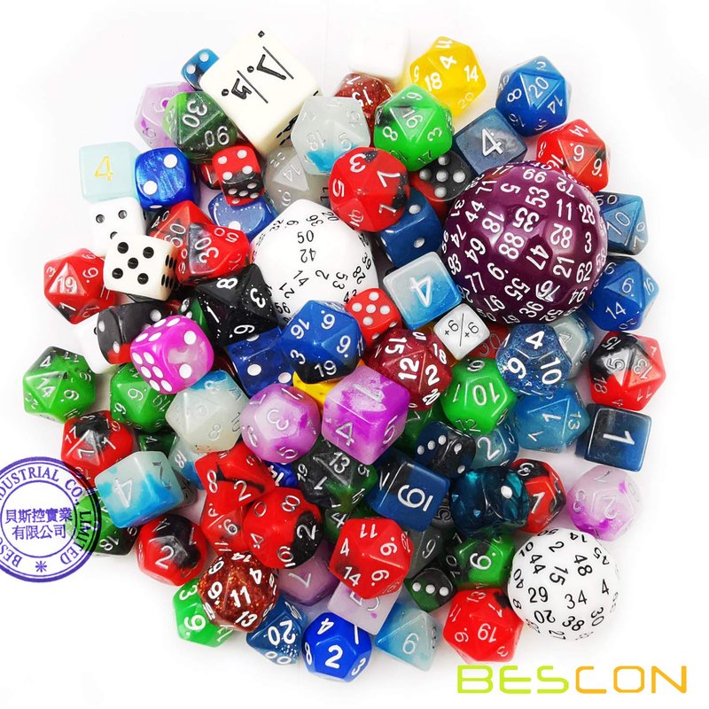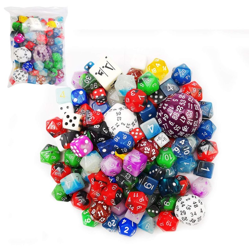 There are approximately 100 factory second dice in this bag.(a little more or less than 100pcs, all in random) These dice are mixed in a variety of sides, shapes, designs,styles, colors. Every bag does not necessarily have every style & color. Sides may include 4, 6, 8, 10, 12, 20, 50,60,100 sided dice (and possibly other sizes) in colors that include (but are not limited to) marble, glitter, opaque and translucent. They are all better rejects dice. Can be used for replacement dice Customize your games with your very own personal set of dice Dice come in all sorts of types, styles and colors Each set in plain polybag packing.