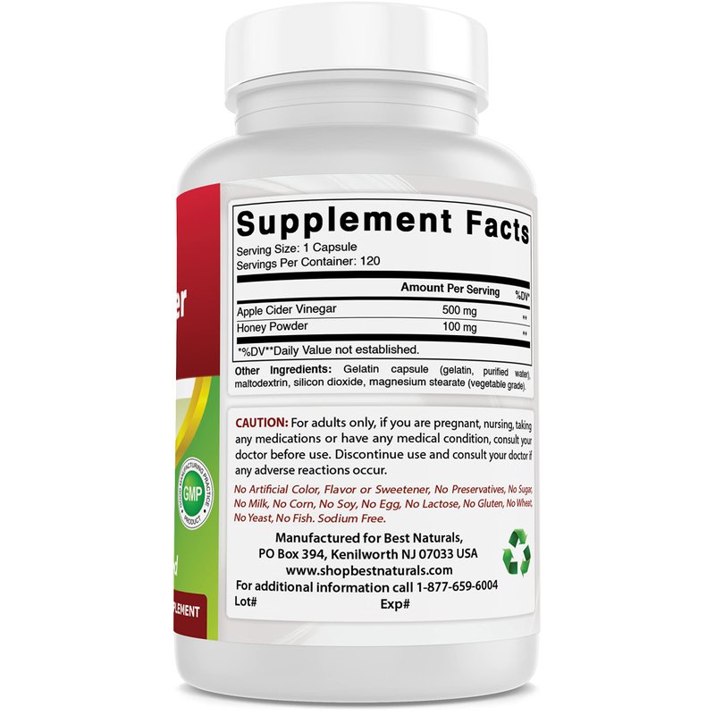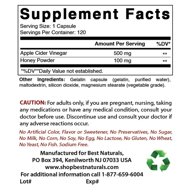 - 600 mg of Apple Cider Plus per Capsule - 120 Capsules per Bottle.