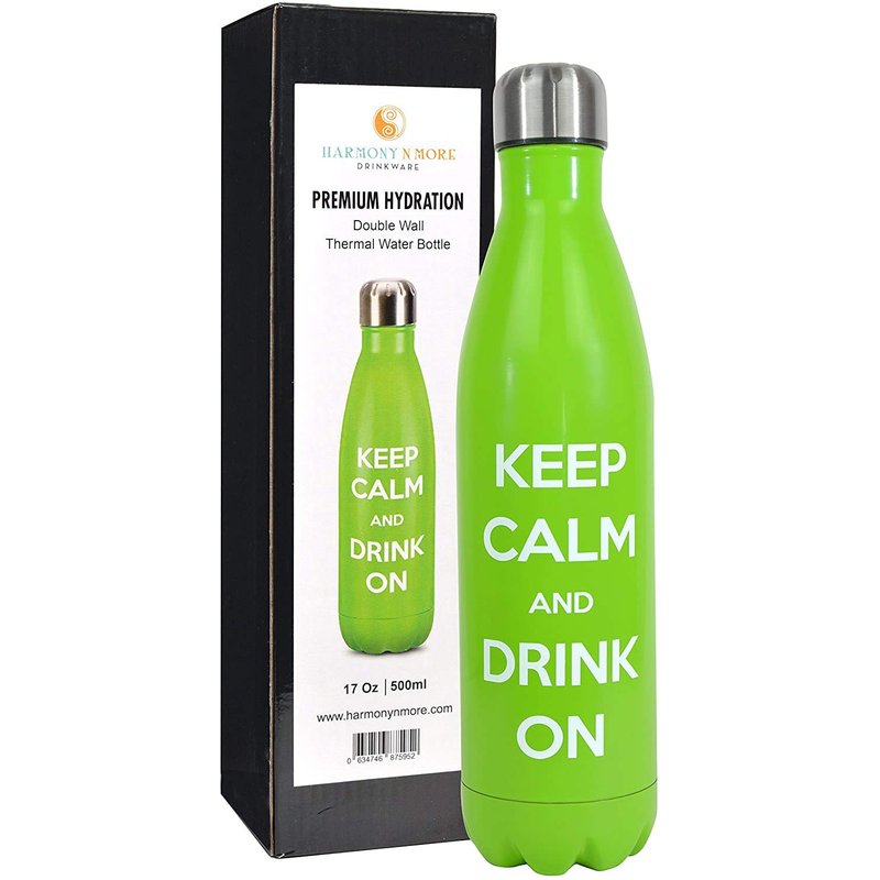- ON SALE ! STAY CONSCIOUS, DRINK MORE – A premium quality double wall water bottle with a classic slogan “Keep Calm and Drink On” to help you stay relaxed, encourage you to drink more water through the day, the bottle is designed to continuously remind you of the need to drink water even during your busy schedule.