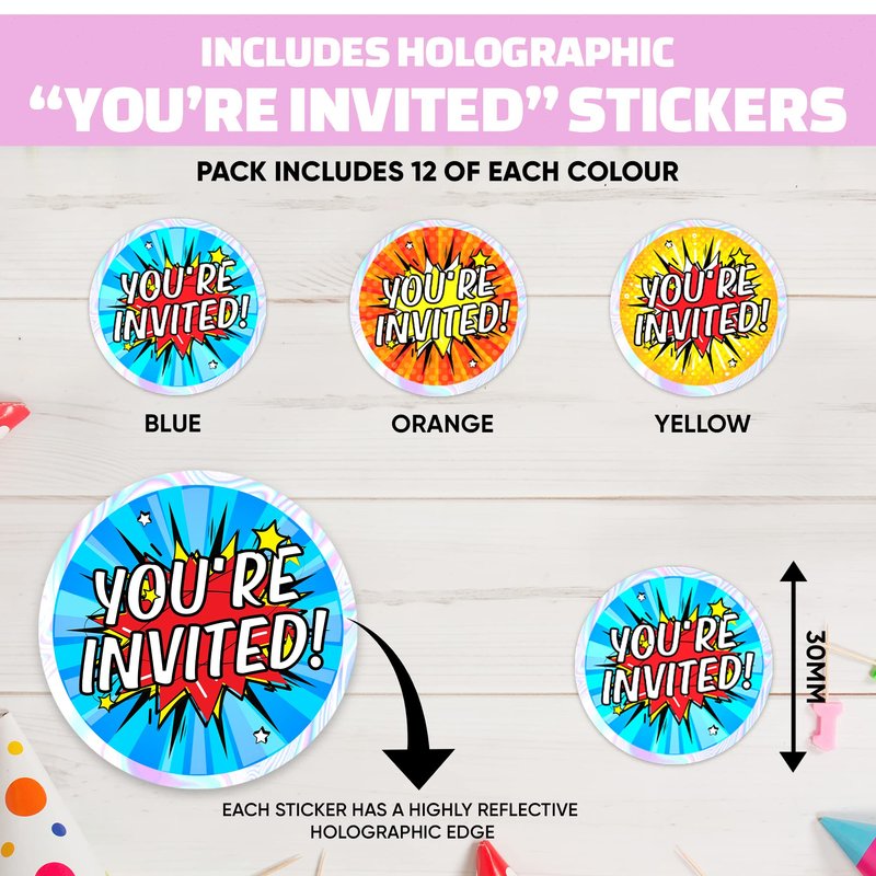 - INCLUDES HOLOGRAPHIC STICKERS: This pack of invites includes 36 super cool "YOU'RE INVITED" holographic stickers which are used to seal your invitations shut once you've written them out. The pack includes 3 different colours, blue, orange and yellow. You're guests will be super excited when they receive on of these invites.