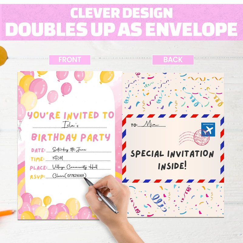 - FOLDING ENVELOPE DESIGN: These invitations have been cleverly designed with a doulbe sided print, so that once you have written on them, you can fold them closed and they will look like an envelope. The envelope has a super cool "Air Mail" style design and on the back it features a confetti pattern to really set the party mood!