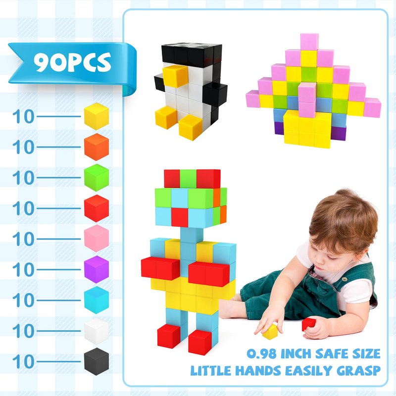 - Advanced Magnetic Cubes: Magnet blocks set includes 90 magnetic blocks in 9 colours and an idea booklet. Children will be captivated by the beautiful colours and light clicking sound of magnetic cubes. Magnetic building cubes allow kids to explore and create endless possibilities from simple structures to complex designs