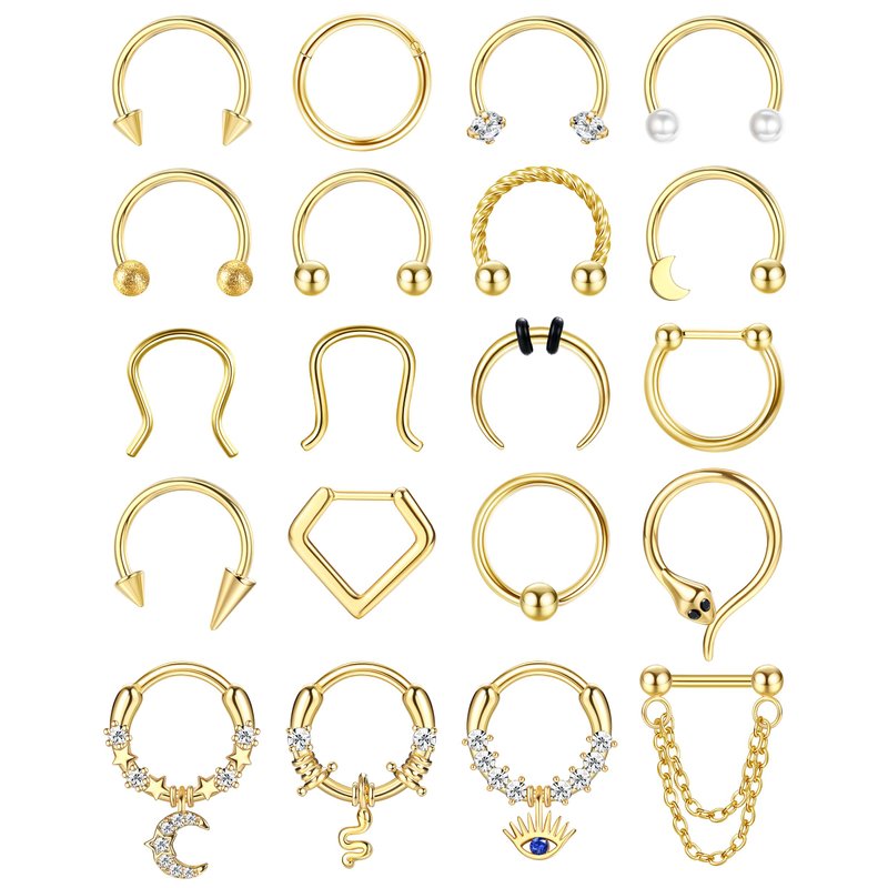 - ๐๐ซ๐๐๐๐ ๐ท๐๐๐๐๐๐๐ ๐ฑ๐๐๐๐๐๐๐Our septum rings 16g includes 20pcs septum clickers in different styles, including horseshoe septum rings, dangle nose rings hoop, daith piercing jewelry and so on. Available in 3 colors: Steel, Gold-tone & Black. Our surgical steel septum ring 16g pack offers a variety of styles to meet your different matching needs. โโCute & Easy to Put In