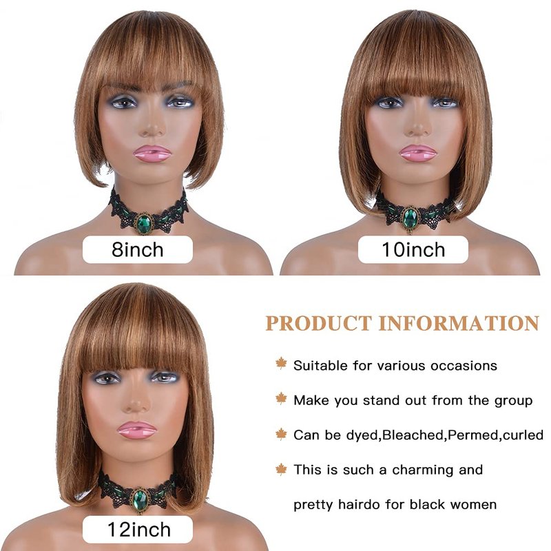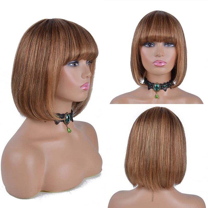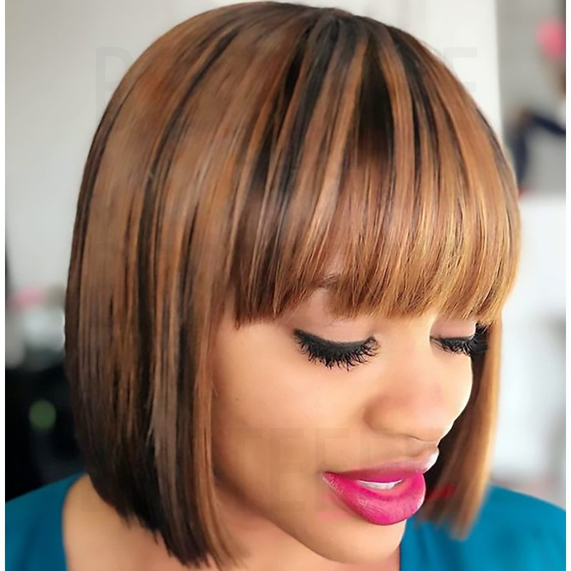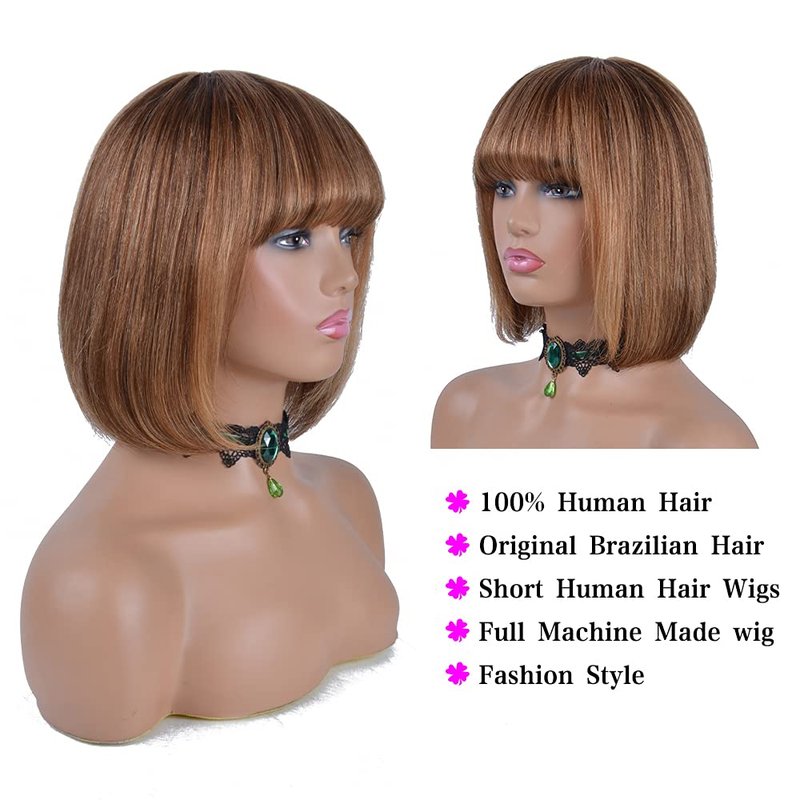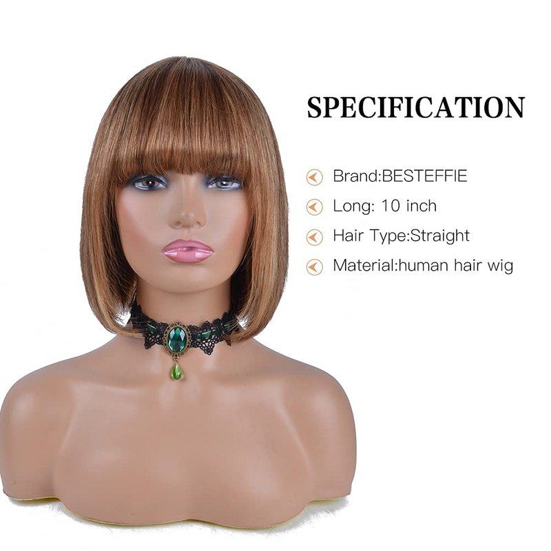 Besteffie Short Bob Wigs Human Hair With Bangs Straight Wigs 100% Brazilian Virgin Hair Glueless Machine Made Wig ombre blonde Highlight wig Short Bob Wigs For Black Women (10 inch, 4/27)