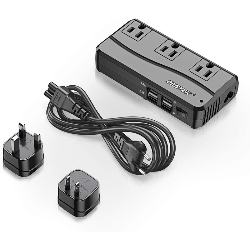 Safety Warnings Maximum wattage: 200W When simultaneously charging multiple devices, please make sure the total wattage is less than 200W to prevent it from overheating or being damaged. Please do NOT use this converter to supply power for your hair dryer, hair straightener or curling iron regardless of their wattage. Please don’t use this converter with appliances rated at 220V-240V AC. This product is only able to supply power for 100V-120V AC devices. BESTEK 2nd Generation Portable Power Converter The original power converter now is upgraded with built-in protections to ensure superior performance and safety. Worldwide Power Voltage Converter With the BESTEK Power Converter, you don’t need to worry about voltages in different countries. It converts overseas voltage from 90-220V to 110-120V and powers up your US electronic device safely. All-in-One Design Boasts 3 AC outlets and 4 6A USB charging ports, enabling you to charge 7 devices simultaneously. 3 plug adapters and 1 EU plug cable cover the sockets all over the world. Multi-protection System NRTL safety tested. Over-current, over temperature, output short-circuit, surge protections and more advanced safety features keep you and your devices safe. Specifications: Input Voltage: 90-260V AC AC Output: 100-120V/AC AC Output: 200W rated, 230W max USB Output: DC 5V/4.2A rated, 6.0A max (4 USB ports accumulative ) Input cable: two prongs AC input cable with EU plug Additional replaceable plugs: UK,US and AU plug Certification: TÜV SÜD Listed. What You Get 1 x BESTEK Power Voltage Converter 1 x EU Cable 3 x Travel Adapter