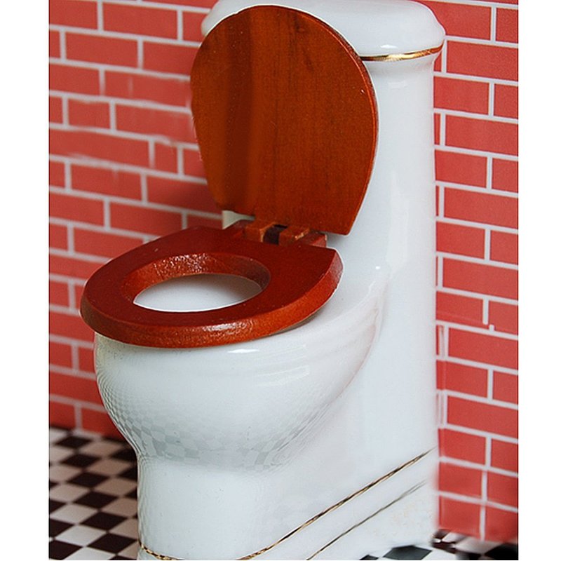 Material: Porcelain, metal (bathtub chain), wood (toilet lid)