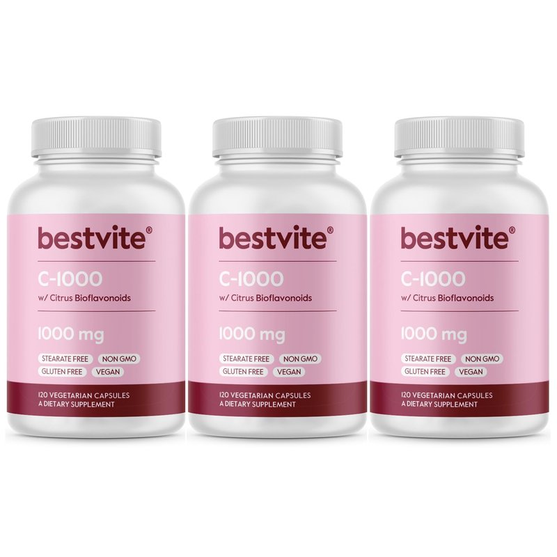 BESTVITE Vitamin C 1000mg (360 Vegetarian Capsules) (120 x 3) with Citrus Bioflavinoids - No Stearates - Vegan - Non GMO - Gluten Free