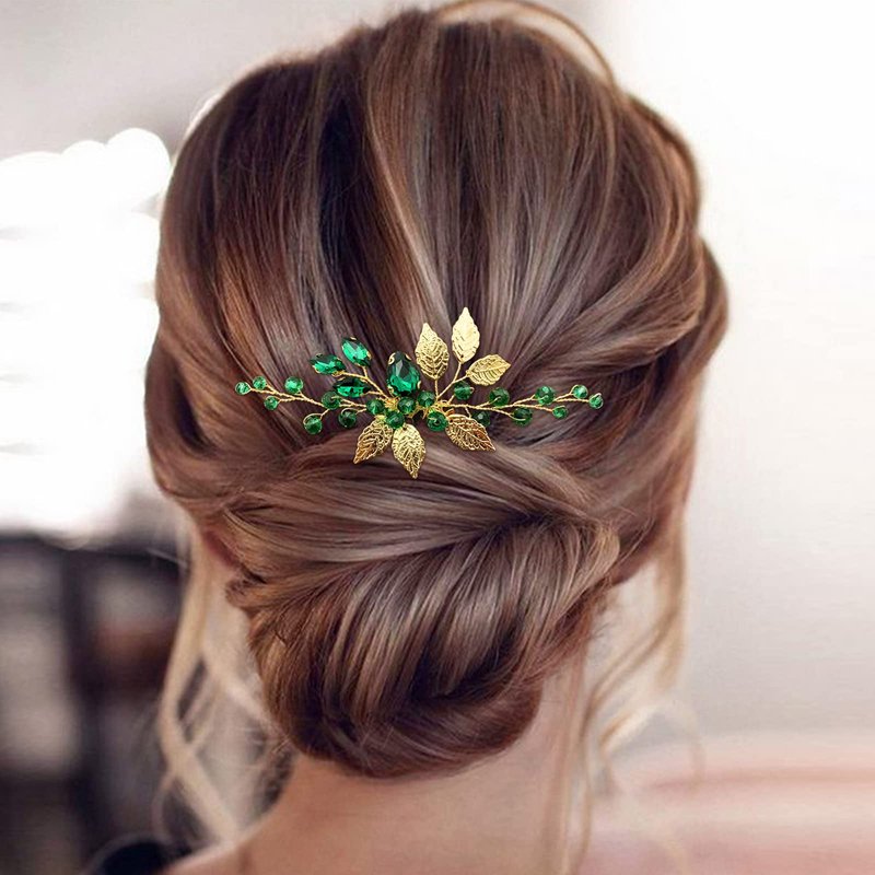 BETITETO Bridal Hair Comb Emerald Green Crystal Gold Leaf Vine Hair Piece Accessories for Wedding Bride Women Party (Emerald Green)