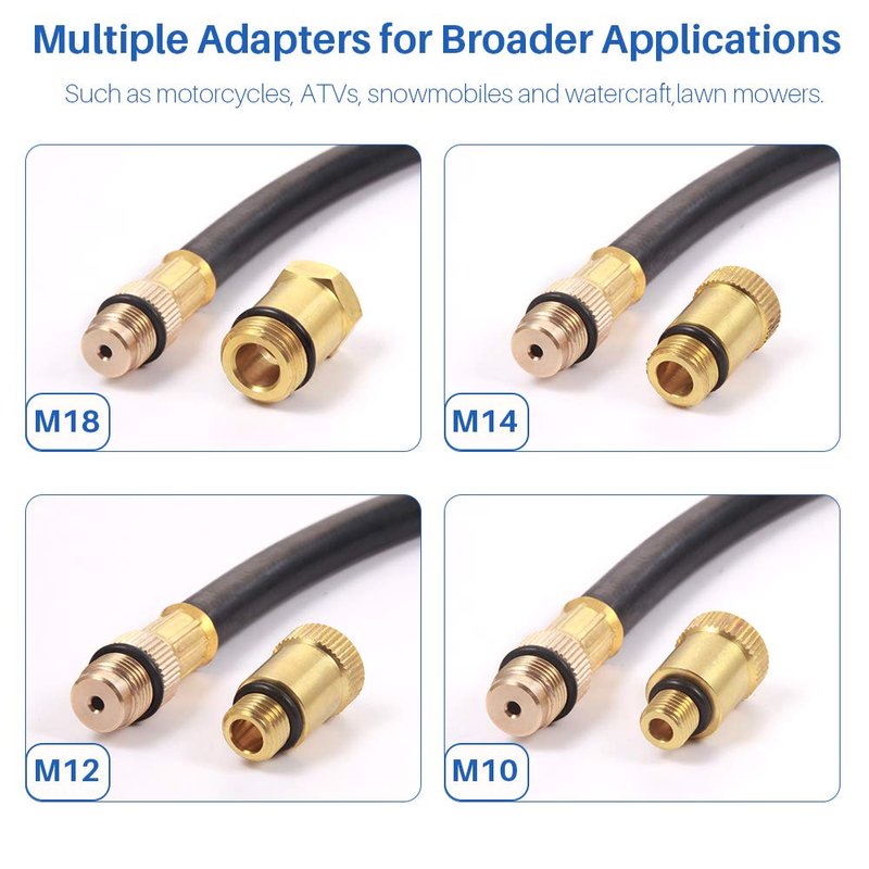 - Includes 17.7" extension hose with 4 sizes (10mm, 12mm, 14mm, 18mm) selectable brass adapters, suitable for petrol engines on motorcycles, cars, trucks, ATVs and more.