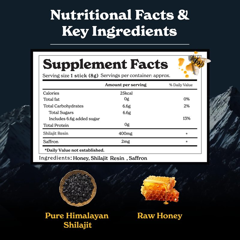 - Cognitive Balance: Packed with essential vitamins such as B6, thiamin, niacin, and riboflavin, our Shilajit + Honey sticks support mental well being.