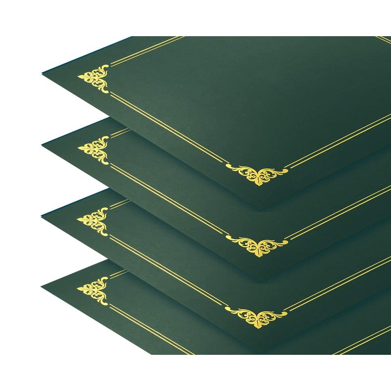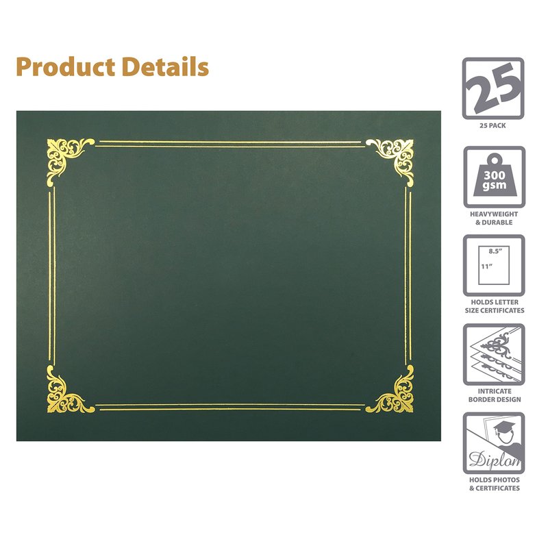 Designed to hold an 8.5 x 11" award certificate, diploma, or document, each heavyweight certificate holder is made of dark green 300 gsm paper with gold foil scroll design to accent its cover. Each measures 11.25 x 8.75" folded with reinforced interior edges and die-cut slots in four corners for a secure hold. A total of 25 certificate holders are included in the pack.