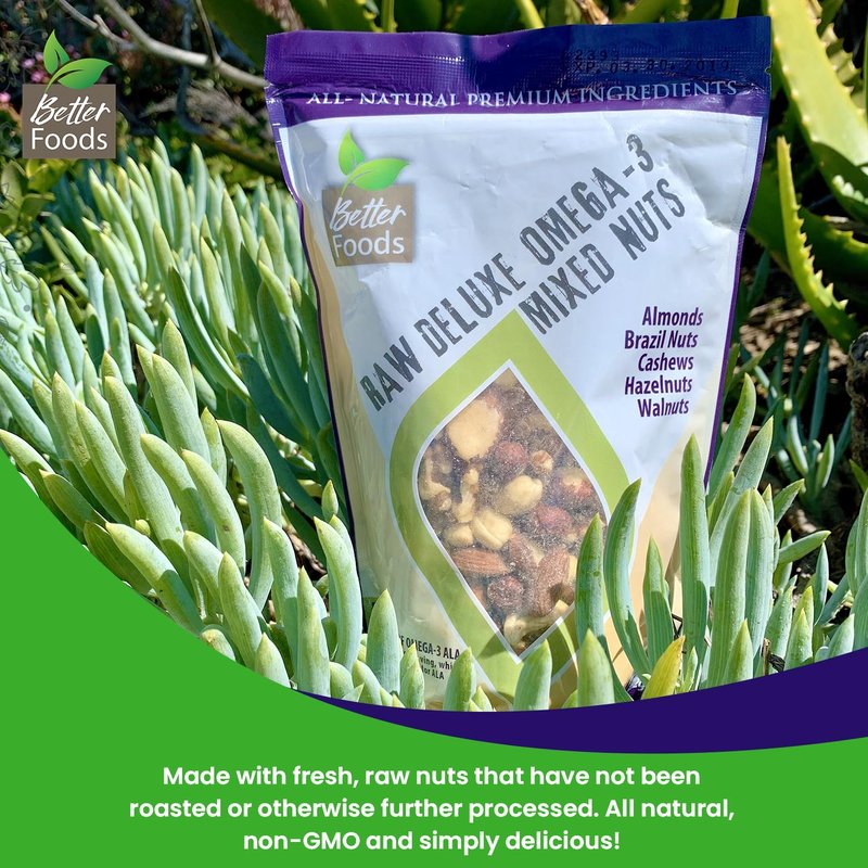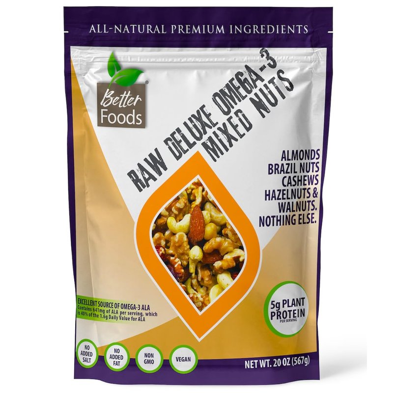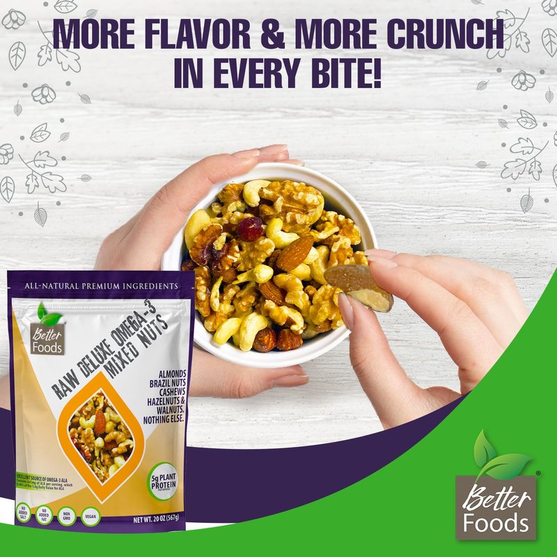 BetterFoods Raw Unsalted Deluxe Omega-3 Mixed Nuts - No Added Salt/Sugar, Non-GMO, Gluten/Soy-Free, Vegan - Almonds, Brazil Nuts, Cashews, Hazelnuts, Walnuts - Wholesome Snacking and Toppings, 20oz