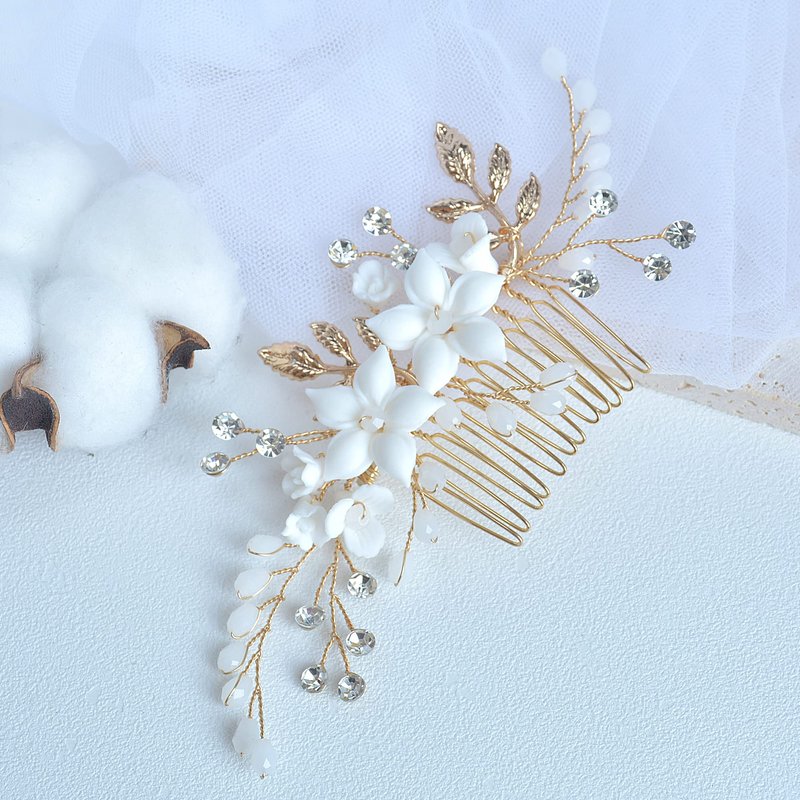 - Delicate wedding hair accessory made of exquisite crystals, white ceramic flower, light gold plated leaves and soft wire, 100% handmade and well crafted, romantic and gorgeous design for your big day.