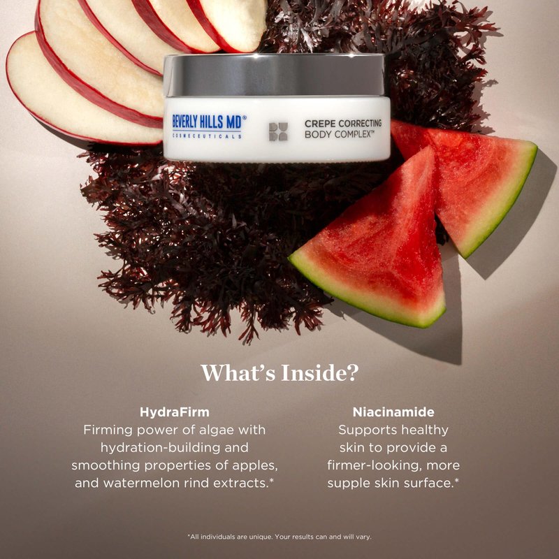 - VISIBLY FIRM & SMOOTH ON CONTACT: Beverly Hills MD Crepe Correcting Body Complex is specifically formulated to help smooth and firm the appearance of wrinkled, “crepe-like” skin on the body. Made with high-intensity moisturizers and a powerful skin-smoothing complex called HydraFirm, this rich formula is designed to provide both immediate and long-term results.*