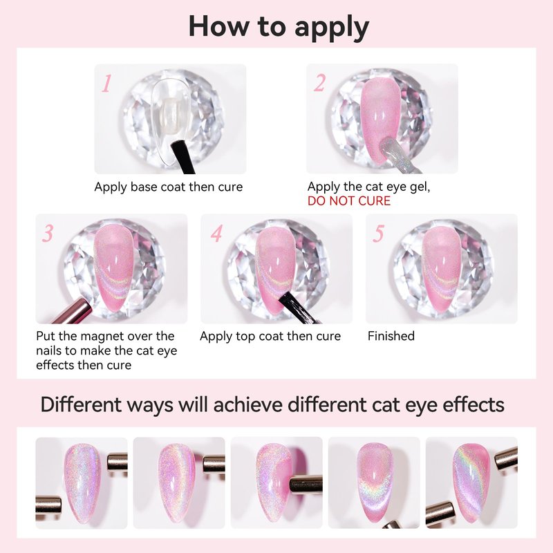 - 【Warm Tips From Bevimee】 1.This Holographic Cat Eye Gel Polish need use magnet to get cat eye effect. 2.This is UV gel nail polish, requires cured under the nail lamp for 90-120 seconds.3.We suggest to apply 2-3 layers of gel to get desired saturation. 4. Before use, Please read our usage steps carefully to get better effects.