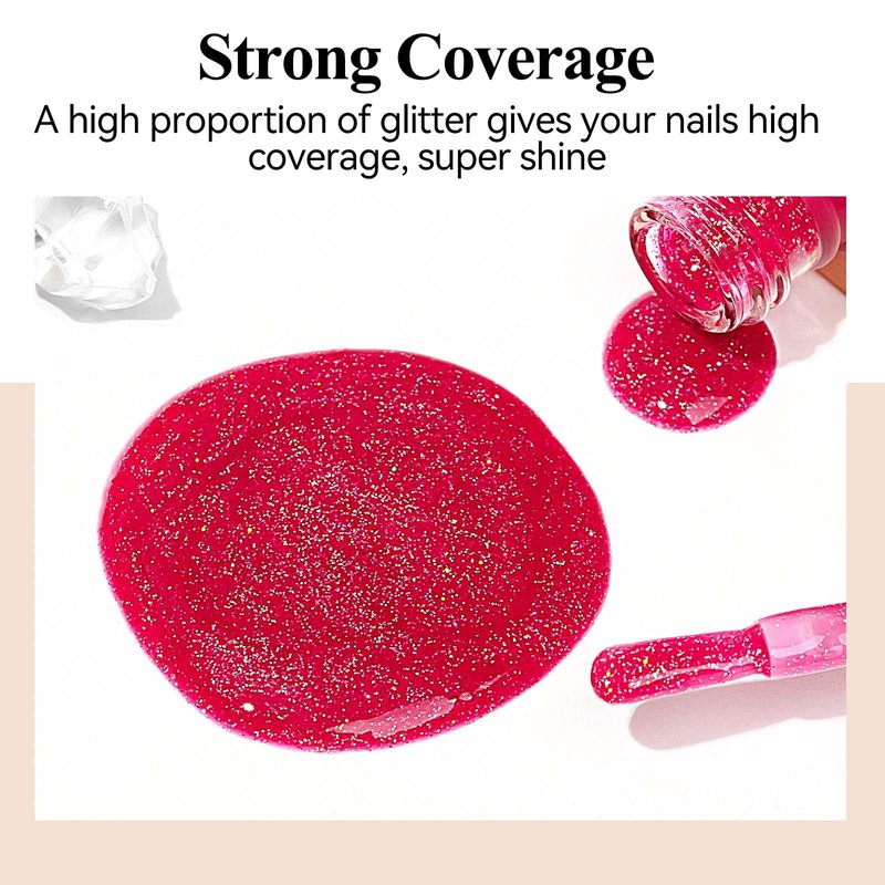 - High Coverage Shimmer Effect: The glitter is dense, but not too thick, Usually we recommend applying 3 coats to get opaque coverage; The shimmer glitter nail polish is great for finger and toe use, makes a great nail look