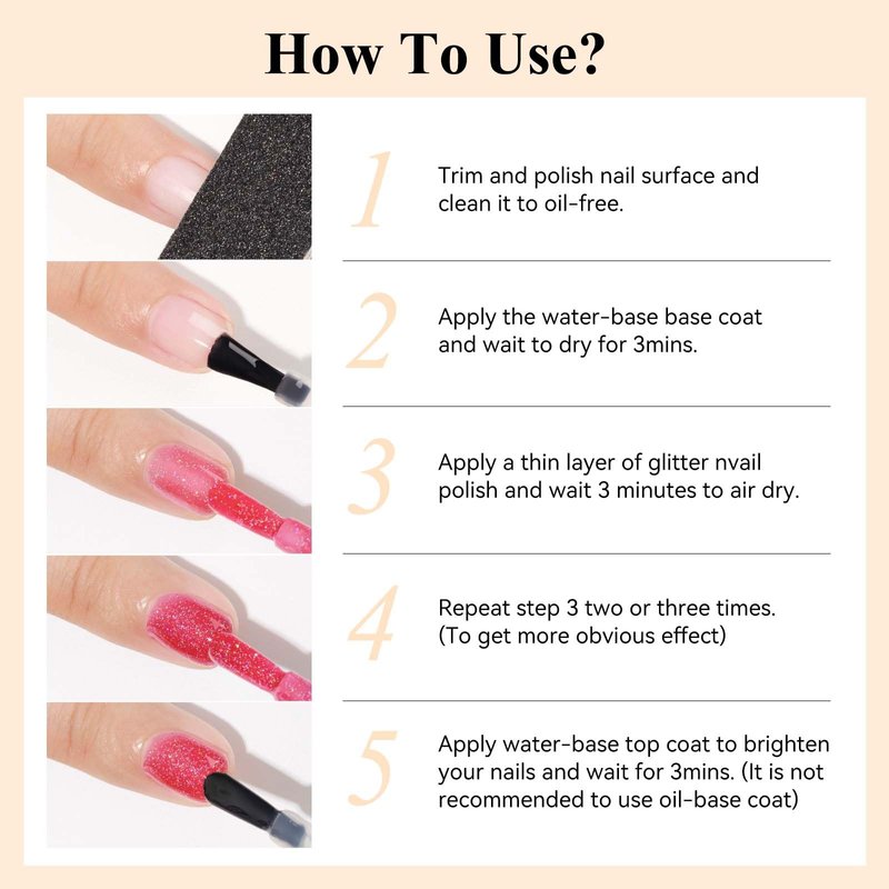 - Quick Dry Glitter Nail Polish: Adopts a fast-drying formula, which can be colored quickly and air dries quickly within 3 minutes, does not require any other tools such as UV lamps, getting the desired manicure effect in a few minutes