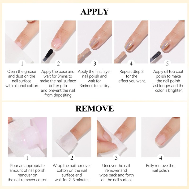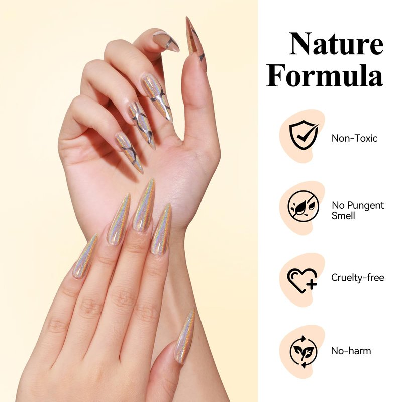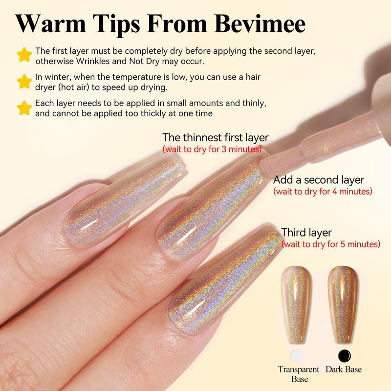- 【Non Toxic & Healthy】Bevimee holographic nail lacquer polish is made of natural ingredients, healthy, non-toxic formula and Cruelty Free, The holographic nail polish won't harm your nails and skin, slight odor is normal.