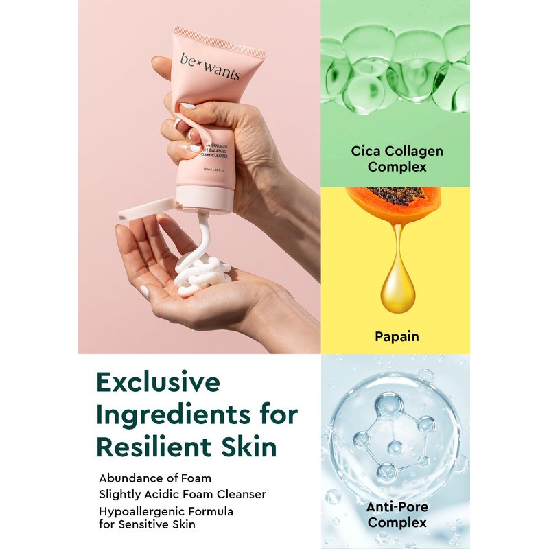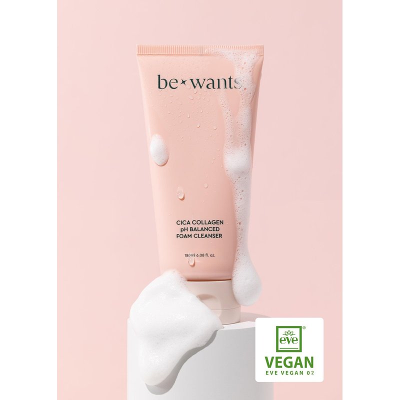 - ✔️ Immerse yourself in the world of Korean skincare with BE+WANTS Cica Collagen Foaming Cleanser. This pH-balanced, gentle daily facial cleanser, enriched with CICA (32%), vegan collagen, and papain, offers a deep cleansing experience for sensitive skin.
