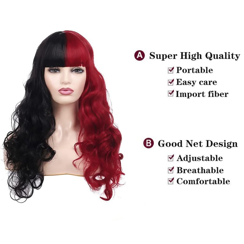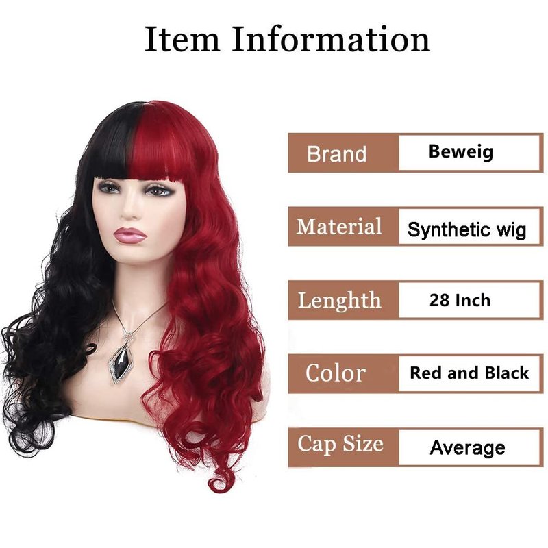 Beweig Half Red Black Wigs with Bangs Long Curly Wavy Cosplay Wig Synthetic Heat Resistant Halloween Costume Wig With Wig Cap