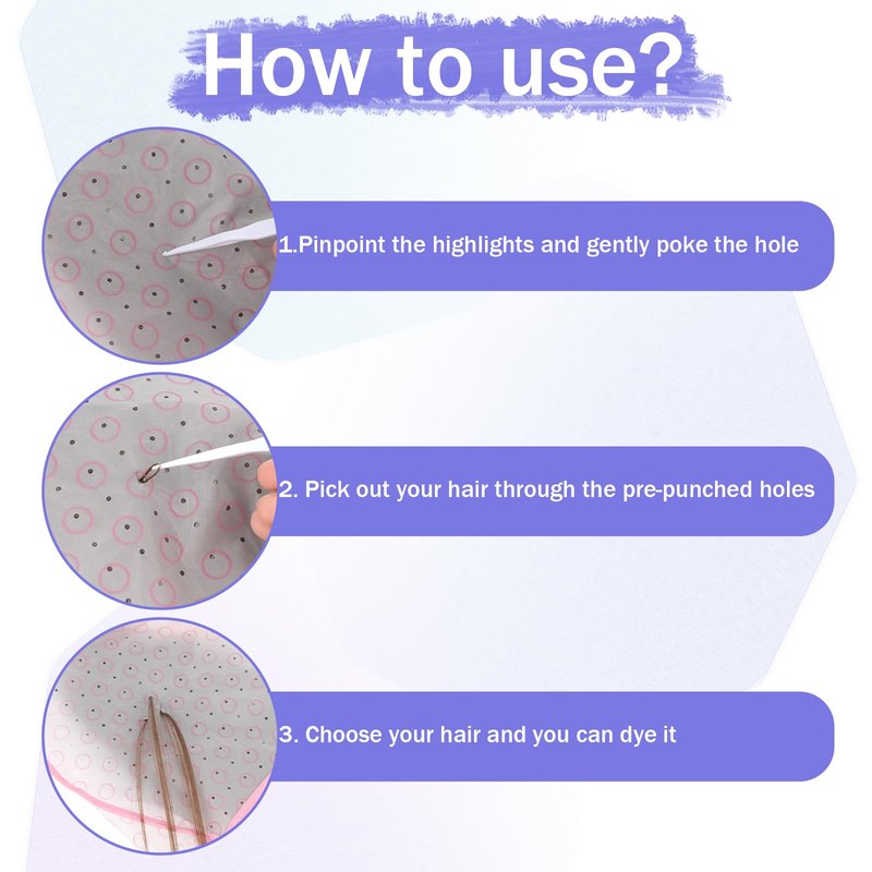 - 【Easy to Use】Put on the hair highlighting cap and tie the attached ties together at the neck for a secure fit, use the hook needle to poke through holes and pick out the hair that needs highlighting according to your preference, and then you can start your hair dyeing