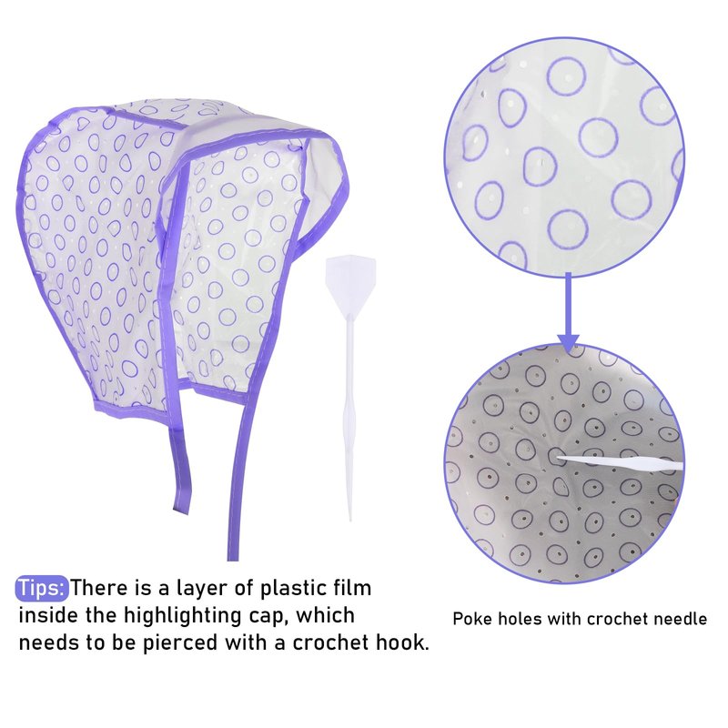 - 【Easy to Use】Put on the hair highlighting cap and tie the attached ties together at the neck for a secure fit, use the hook needle to poke through holes and pick out the hair that needs highlighting according to your preference, and then you can start your hair dyeing
