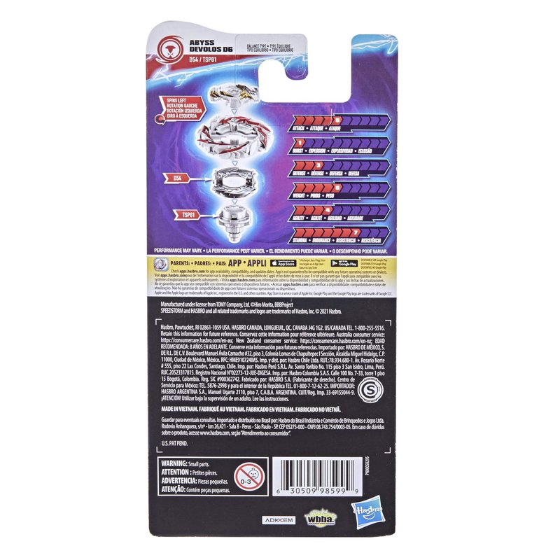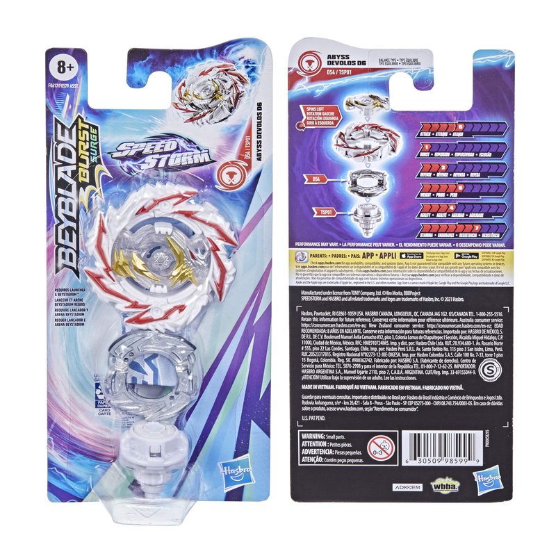 - SPINNING TOP FOR BEYBLADE BURST BATTLES: Includes left-spin Beyblade Burst Surge Speedstorm Abyss Devolos D6 D54 TSP01 balance type top with Storm Chip component