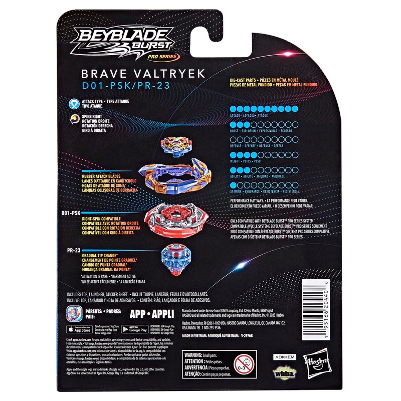 - AUTHENTIC JAPANESE-INSPIRED TOP: The Beyblade Burst Pro Series line features tops with original Takara Tomy Superking top design and deco as sold in Japan. Includes right-spin attack type battling top Brave Valtryek D01-PSK PR-23 with authentic components. Comes with right-spin launcher and sticker sheet