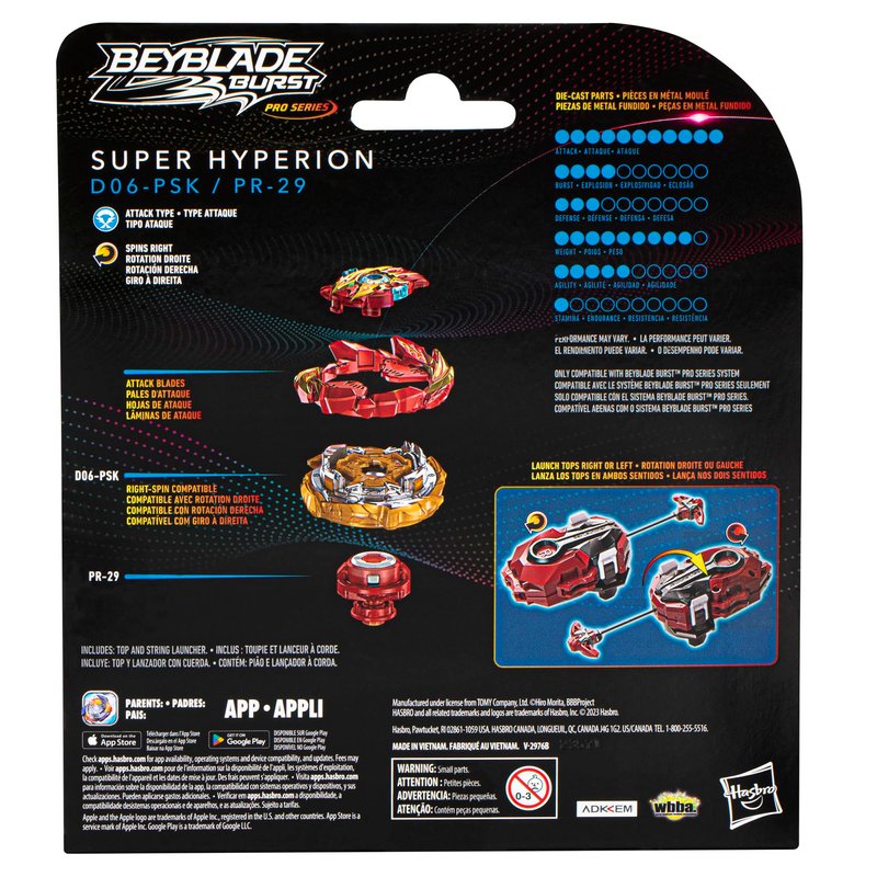 - COMPETE WITH THE ELITE: Includes right-spin attack type battling top Super Hyperion D06-PSK PR-29 featuring rubber performance tip with spin guard, double chassis, and massive attack blades which take the battle to your opponent’s spinning top