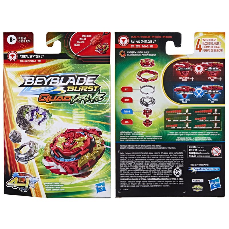 - CUSTOMIZE THE CLASH: Includes left-spin Beyblade Burst QuadDrive Astral Spryzen S7 G11 QD12 TA24-Q B05 top and launcher. Customize top to Core and Apex mode for attack type or to Core+ and Apex+ mode for balance type