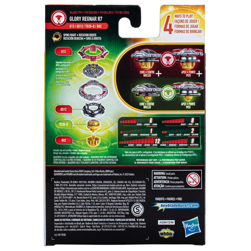 - CUSTOMIZE THE CLASH: Includes right-spin Glory Regnar R7 G13 QD12 TD20-Q B02 top and launcher. Customize top to Core and Apex mode for defense type or to Core+ and Apex+ mode for balance type