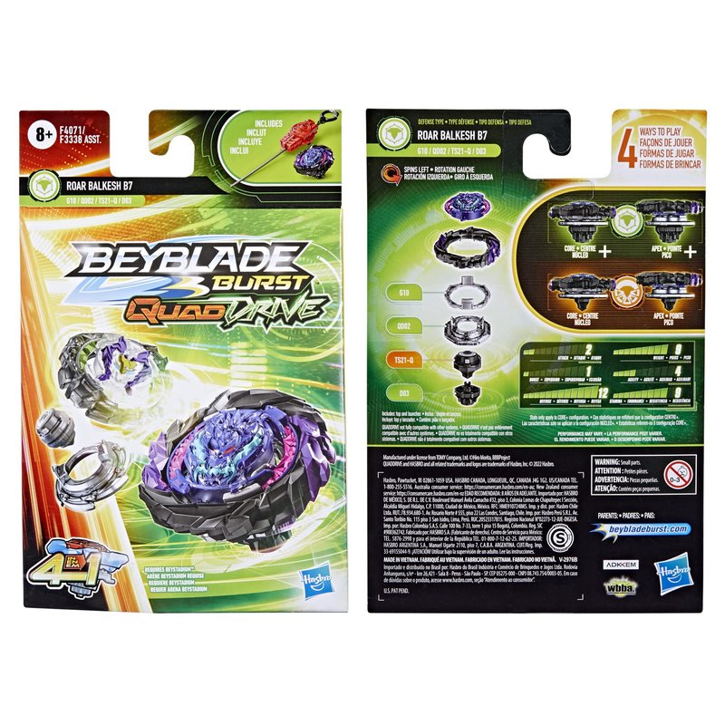 - CUSTOMIZE THE CLASH: Includes left-spin Beyblade Burst QuadDrive Roar Balkesh B7 G10 QD02 TS21-Q D03 top and launcher. Customize top to Core and Apex mode for stamina type or to Core+ and Apex+ mode for defense type