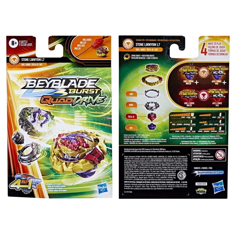 - CUSTOMIZE THE CLASH: Includes right-spin Beyblade Burst QuadDrive Stone Linwyrm L7 G05 QD05 TB14-Q S01 top and launcher. Customize top to Core and Apex mode for balance type or to Core+ and Apex+ mode for stamina type