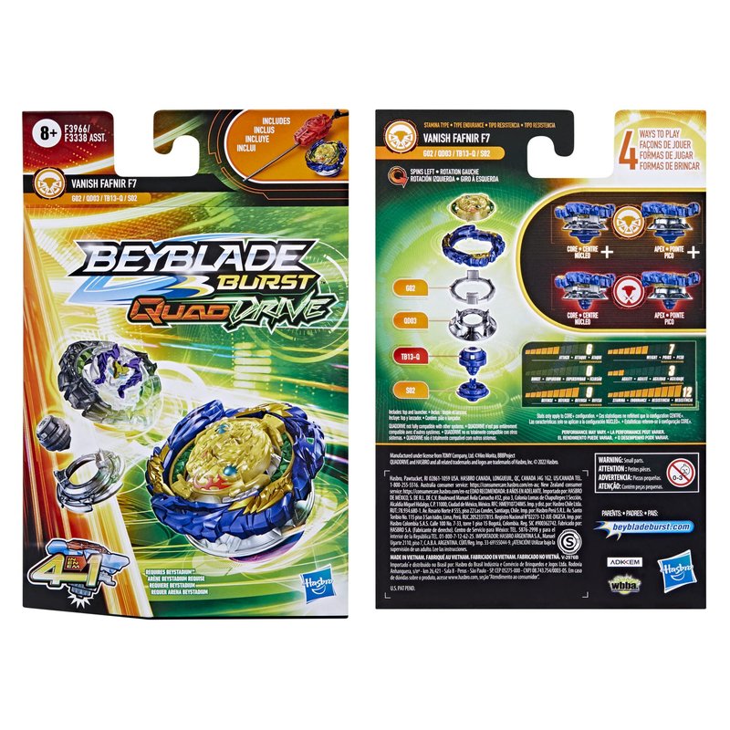 - CUSTOMIZE THE CLASH: Includes left-spin Beyblade Burst QuadDrive Vanish Fafnir F7 G02 QD03 TB13-Q S02 top and launcher. Customize top to Core and Apex mode for balance type or to Core+ and Apex+ mode for stamina type