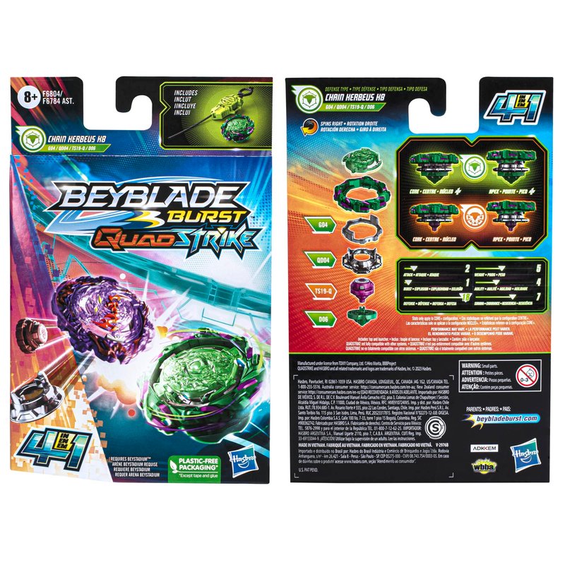 - CUSTOMIZE THE CLASH: Includes right-spin Beyblade Burst QuadStrike Chain Kerbeus KB G04 QD04 TS19-Q D06 top and launcher. Customize top to Core and Apex mode for stamina type or to Core+ and Apex+ mode for defense type