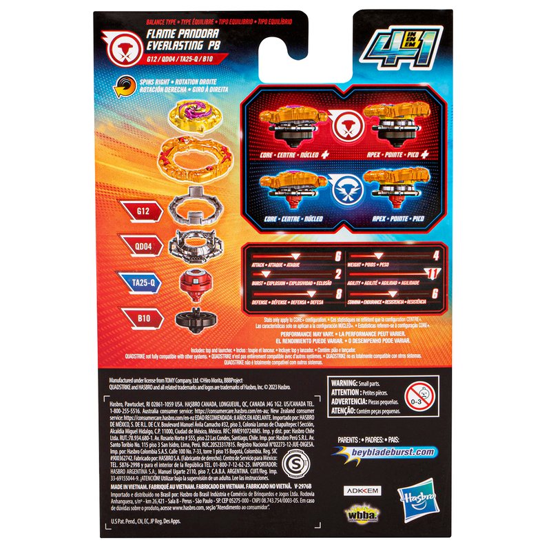 - CUSTOMIZE THE CLASH: Includes 1 right-spin Beyblade Burst QuadStrike Flame Pandora Everlasting P8 G12 QD04 TA25-Q B10 top and launcher. Customize top to Core and Apex mode for attack type or to Core+ and Apex+ mode for balance type