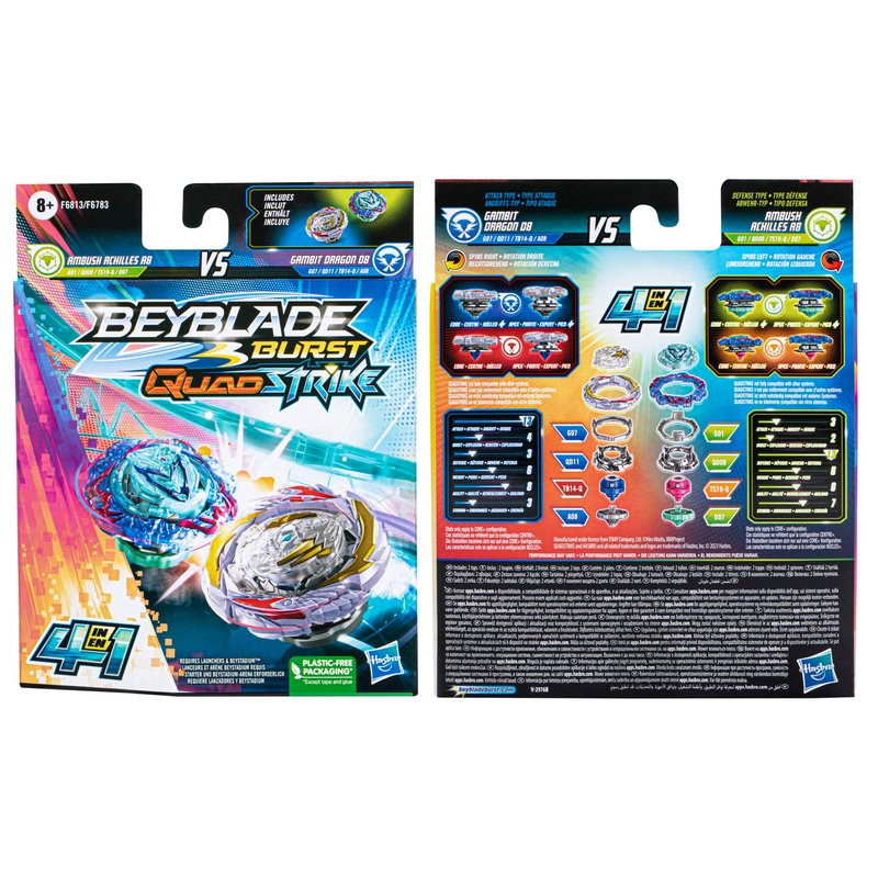 BEYBLADE Burst QuadStrike Gambit Dragon D8 and Ambush Achilles A8 Spinning Top Dual Pack, 2 Battling Game Top Toy for Kids Ages 8 and Up