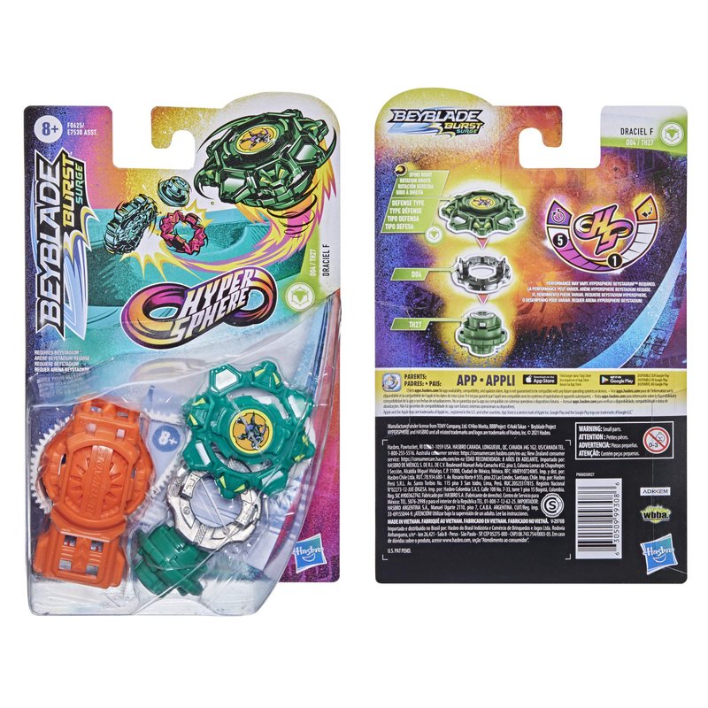 - BEYBLADE BURST COMPETITIVE BATTLING TOP: Includes right-spin Beyblade Burst Rise Hypersphere Draciel F D04 TH27 defense type top and Hypersphere left/right-spin launcher